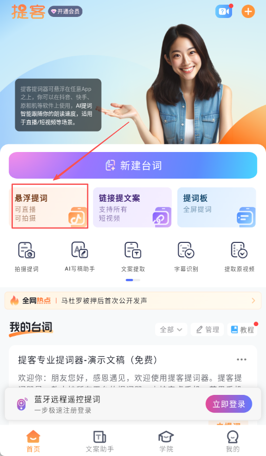4、悬浮提词模式使用方便高效,在录制过程中开启悬浮提词功能,边播边看台词保持视线自然提升录制效果。