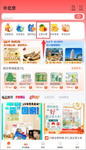 2、选择应季水果分类,浏览各类水果商品信息。