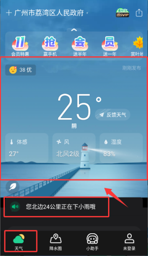 1、在天气板块查看当前温度及降水提示信息。