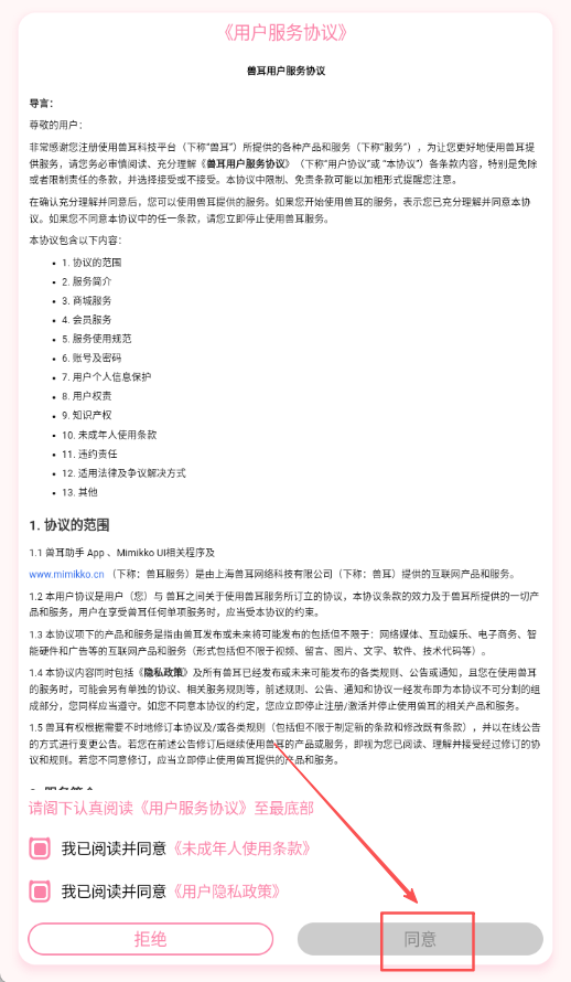 1、打开兽耳助手应用程序进入主界面操作,阅读用户服务协议并勾选同意相关条款政策,点击同意按钮确认协议内容准备注册。