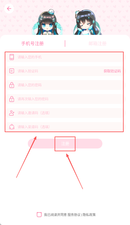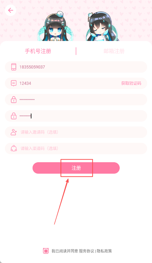 4、勾选我已阅读并同意服务协议隐私政策选项,点击注册按钮完成账号注册操作全部流程。