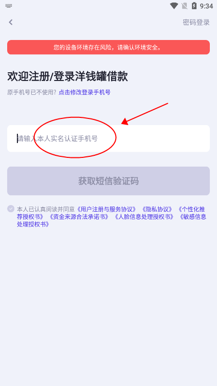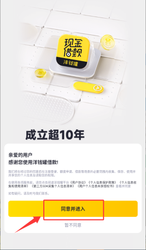 1、启动洋钱罐借款应用,确认用户协议及隐私政策后进入。