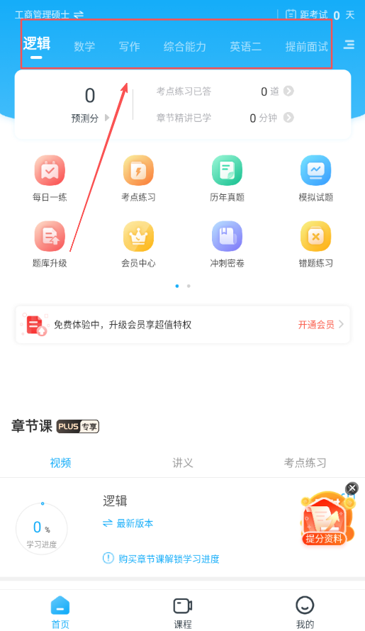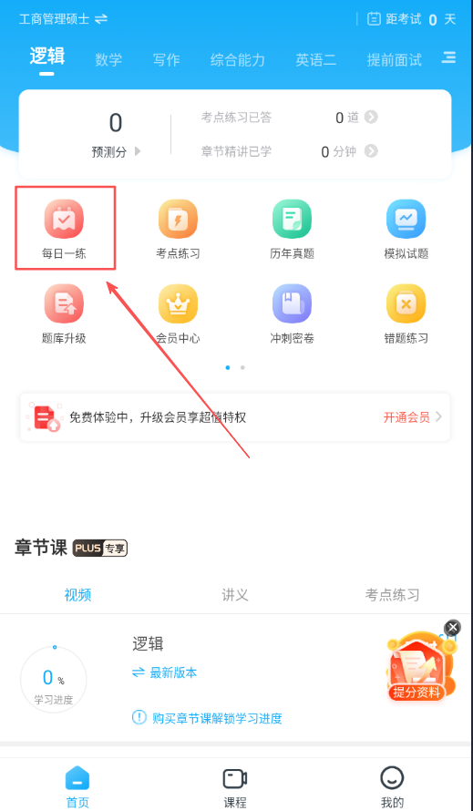 2、在课程板块观看由主流命题专家主讲的免费章节课视频,并参与每日直播课程以便随时与老师交流学习疑问。