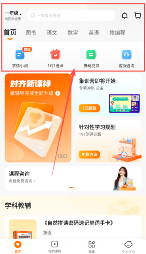 4、首页还提供学情小测和教辅资源,需要测评或买书的话,点击1对1选课或学科教辅就能进一步了解详细情况呢。