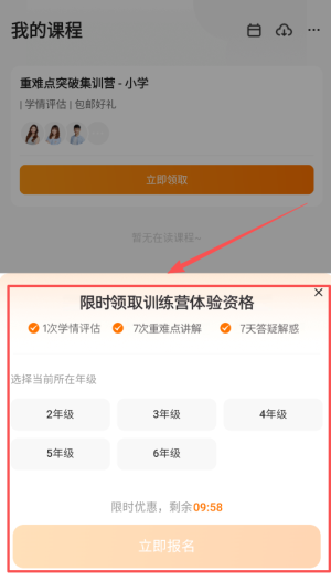 2、登录后进入我的课程板块,这里会显示限时集训营活动,选择孩子对应的年级比如四年级或五年级。