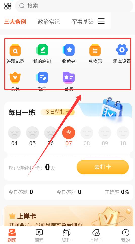 1、中间区域有答题记录和我的笔记等功能入口,底部导航栏则提供了刷题课程等核心功能的快捷切换通道。