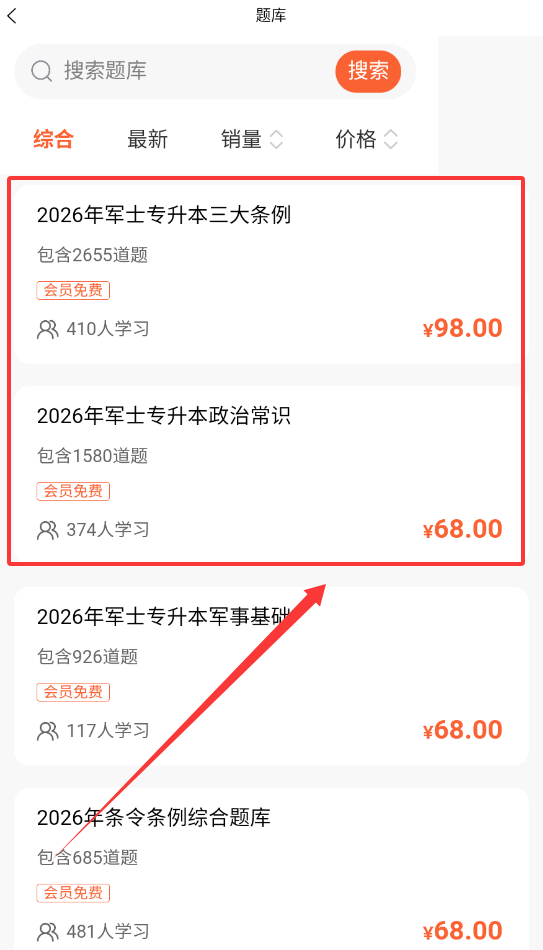 2、还能按综合或销量等条件筛选排序,各类题库会清晰显示题目数量与学习人数等信息。