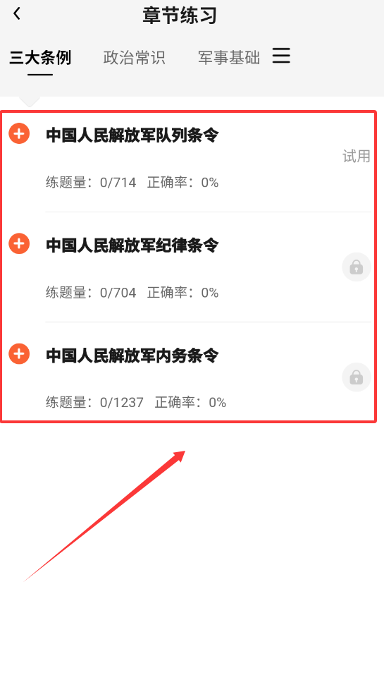 4、每个章节都明确标注了总题量与当前正确率,部分内容提供试用体验方便提前了解题目类型。