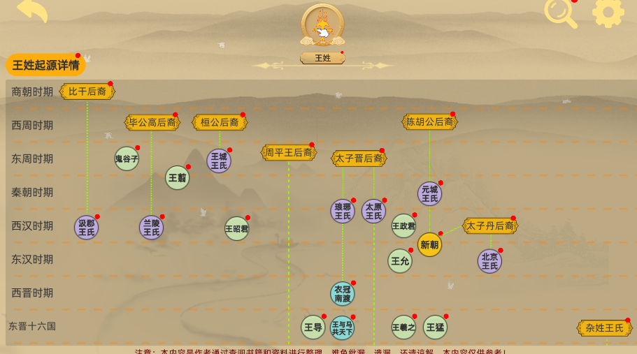 4、姓氏起源模块可查询各姓氏在不同朝代时期的发展脉络与渊源。