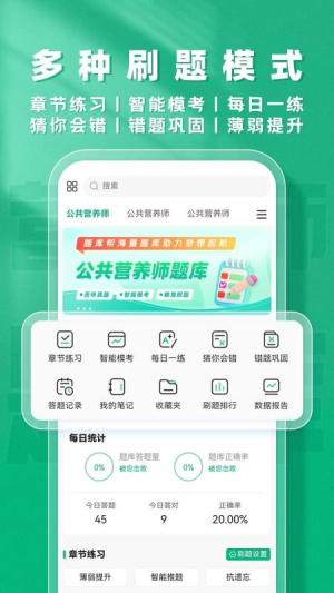 公共营养师题库帮专为备考公共营养师考试的考生设计,整合题库练习、智能督导、模拟试卷及学习资讯等功能,精准匹配考试大纲,覆盖全面考点知识。平台提供多种刷题模式,包括章节练习、每日一练和专项练习,帮助用户针对性提升薄弱环节。