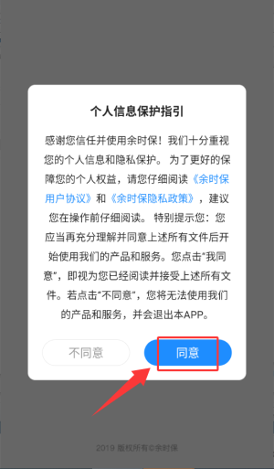 1、启动余时保应用,确认个人信息保护指引后进入。