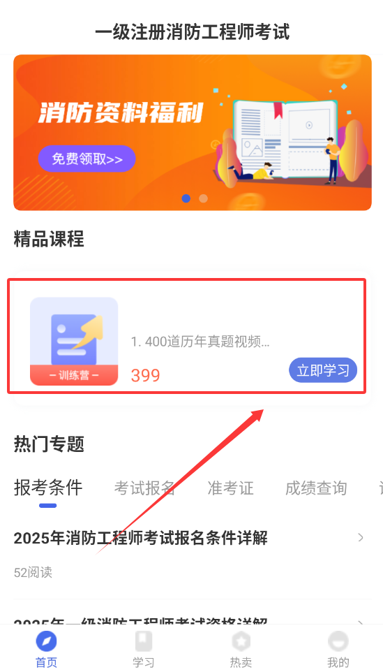 1、打开软件进入首页后,可以看到顶部的资料福利横幅,点击就能免费领取备考资料,很方便哦。