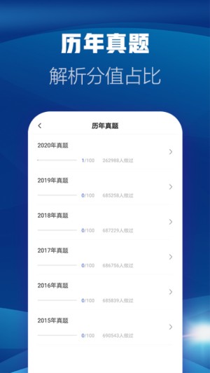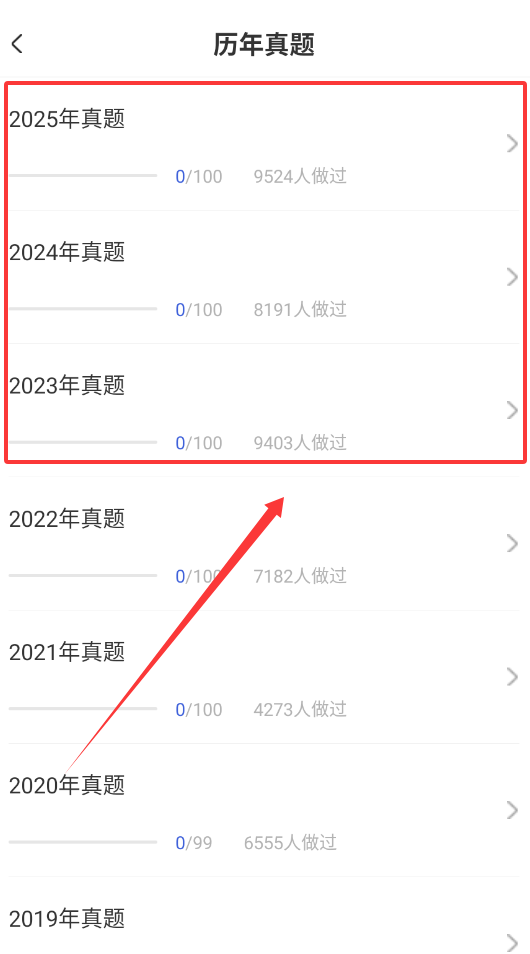 4、想练习真题的话,可以在学习页面找到历年真题模块,选择不同年份的真题进行练习,还能看到大家的做题数据作为参考。