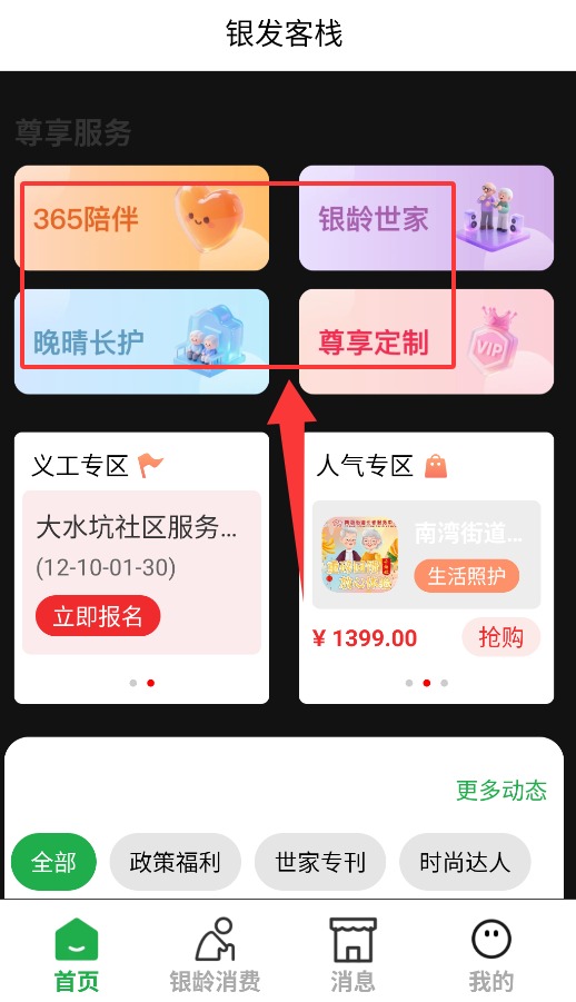 2、首页提供365陪伴、银龄事假、晚晴长护、尊享定制等功能入口。