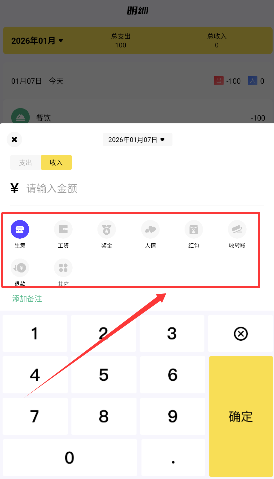 2、点击日期并选择支出或收入类型,输入金额再挑选一个合适的消费类别就好啦。