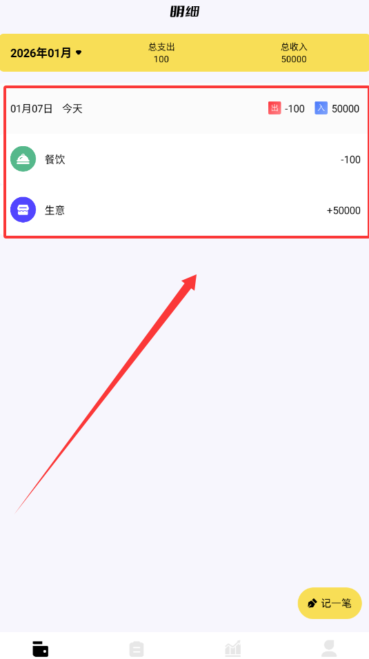 1、打开软件后进入明细页面,就能看到本月总支出和总收入的数据显示了呀。