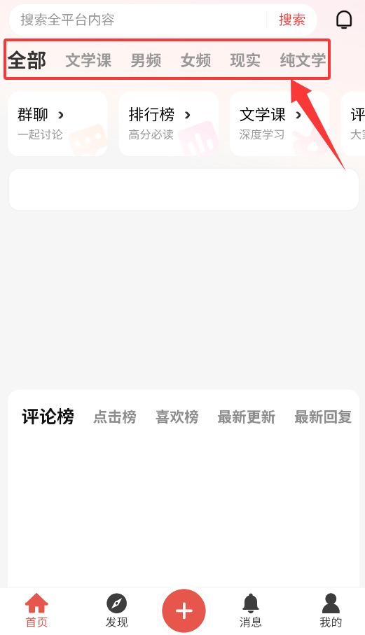 2、首页按分类展示内容,包括文学课、男频、女频、纯文学等板块。