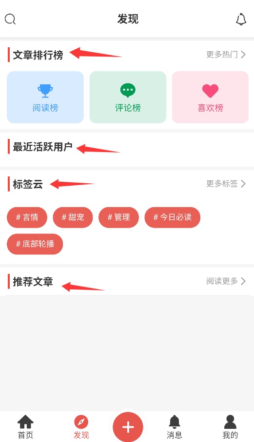 3、发现页可浏览文章排行、活跃用户、标签云及推荐内容。