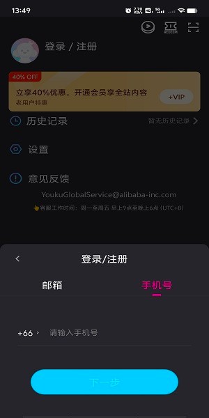 打开优酷国际版后,点击右下角“我的”,并点击左上角的“登录/注册”;