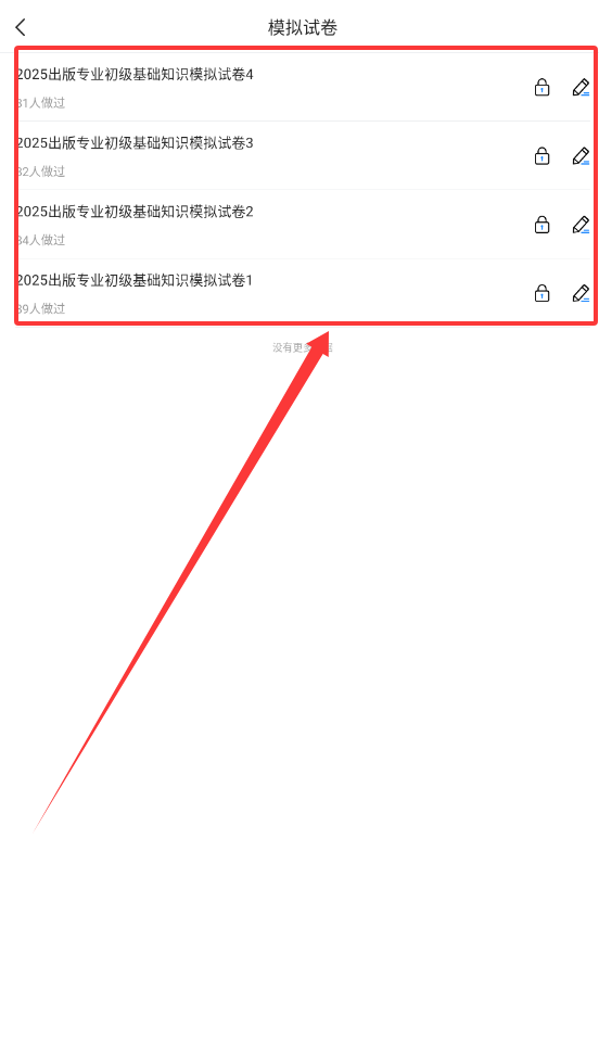 4、页面下拉至底部出现“没有更多”提示即表示所有可用试卷已加载完毕,接下来只需选择一份试卷开始全力冲刺吧。