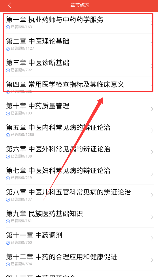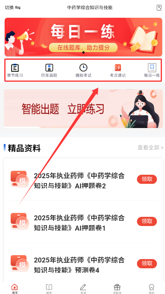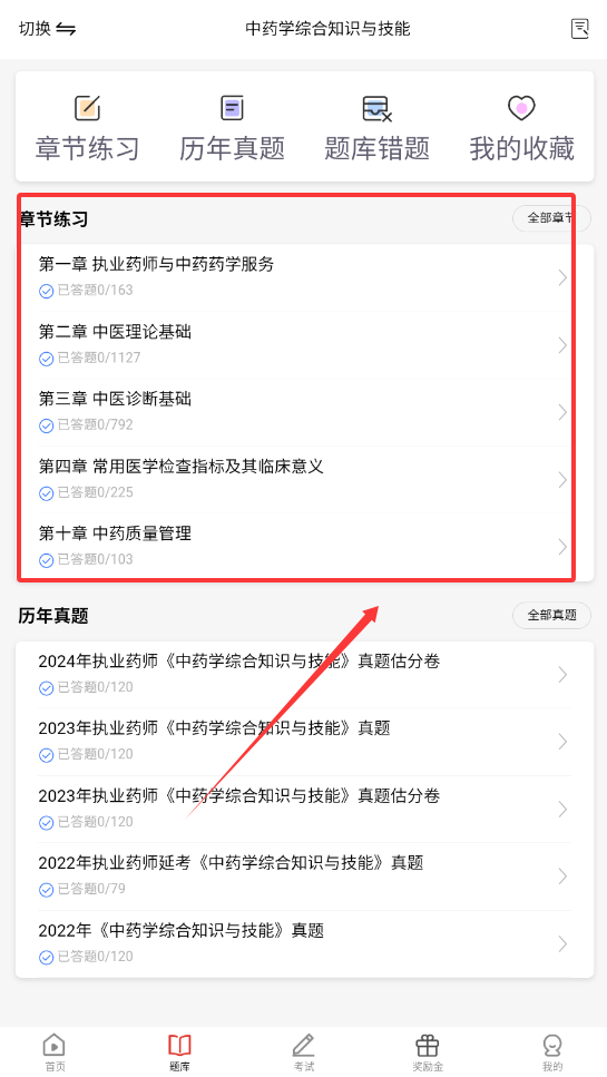 1、进入软件后先找到上方科目切换选项呢,选择你需要的科目比如中药学综合知识与技能就可以开始学习啦。