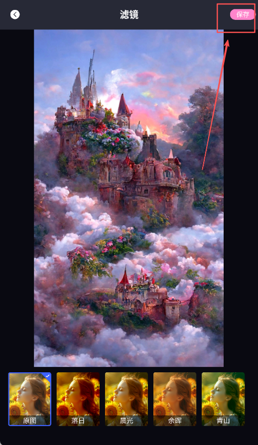 3、进入滤镜编辑页面后选择落日晨光等滤镜效果,进行调整和预览操作确认效果。