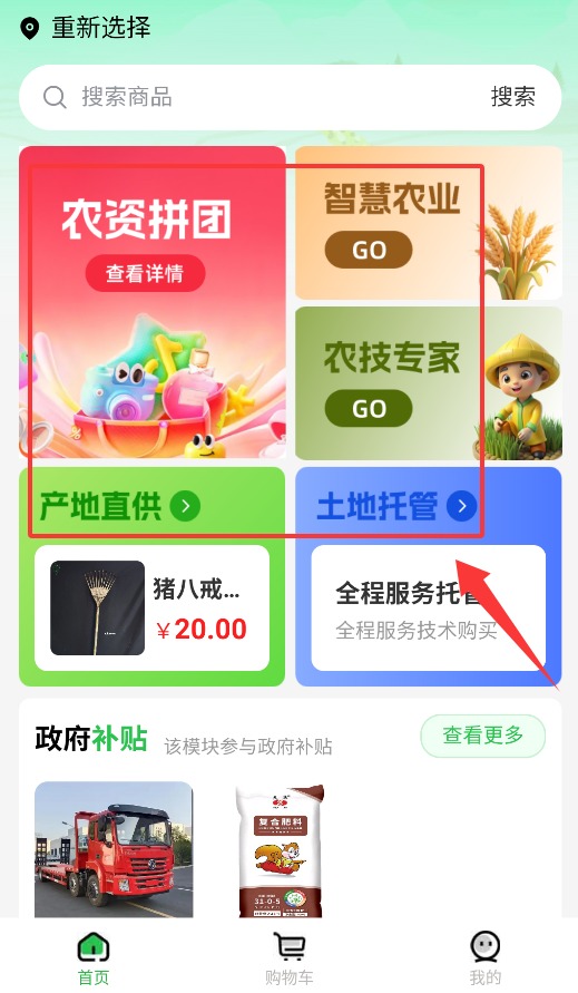 2、首页提供农资拼团、智慧农业、农机专家、产地直供、土地托管等农业相关服务入口。