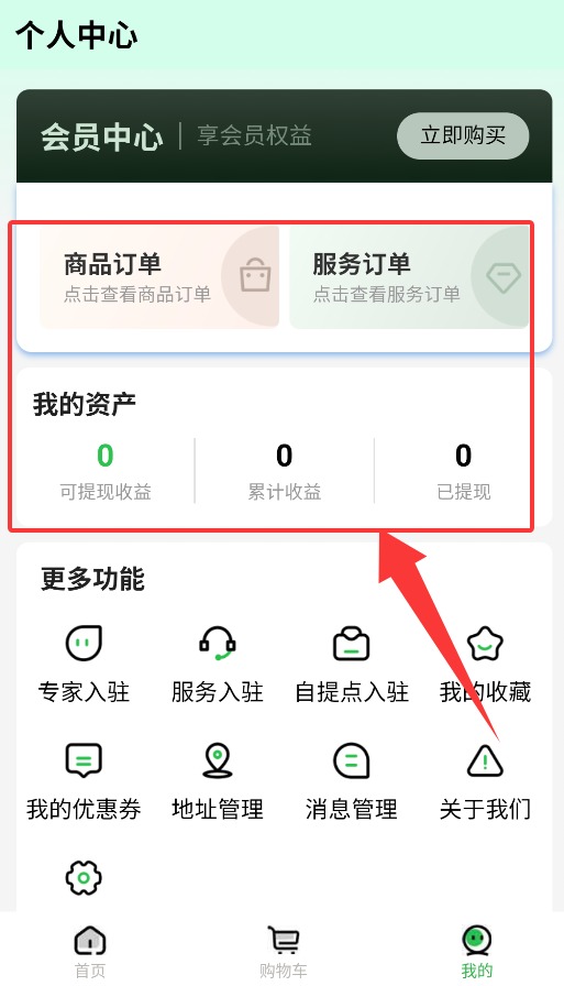 4、个人中心可查看商品订单、服务订单及资产信息(如余额、积分等)。