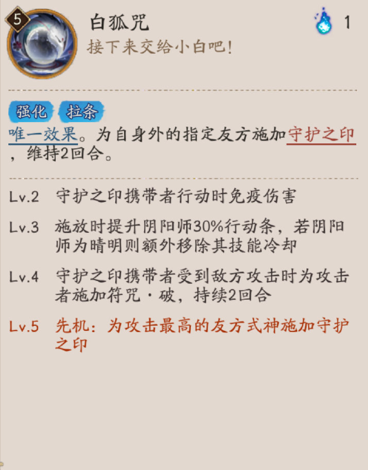Lv.3 施放时提升阴阳师30%行动条,若阴阳师为晴明则额外移除其技能冷却