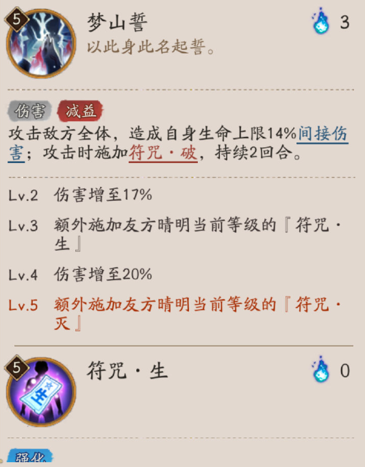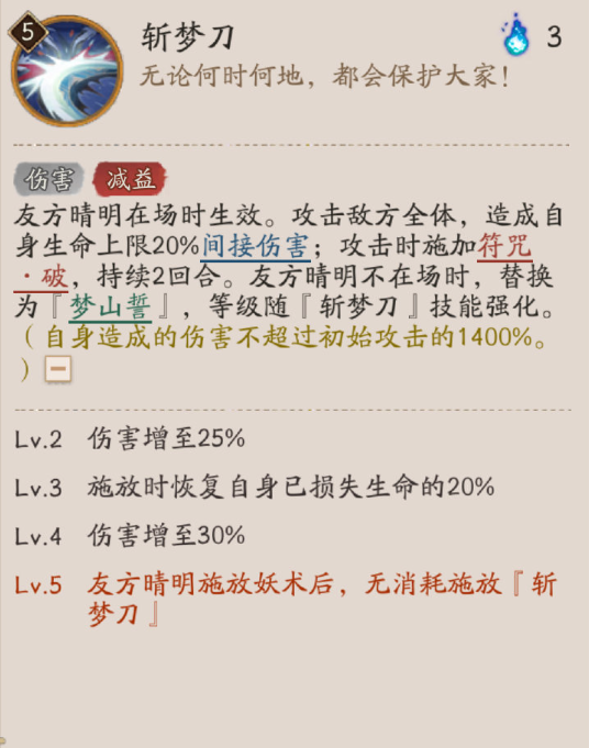 友方晴明在场时生效。攻击敌方全体,造成自身生命上限20%间接伤害;攻击时施加符咒·破,持续2回合。友方晴明不在场时,替换为『梦山誓』,等级随『斩梦刀』技能强化。(自身造成的伤害不超过初始攻击的1400%。)